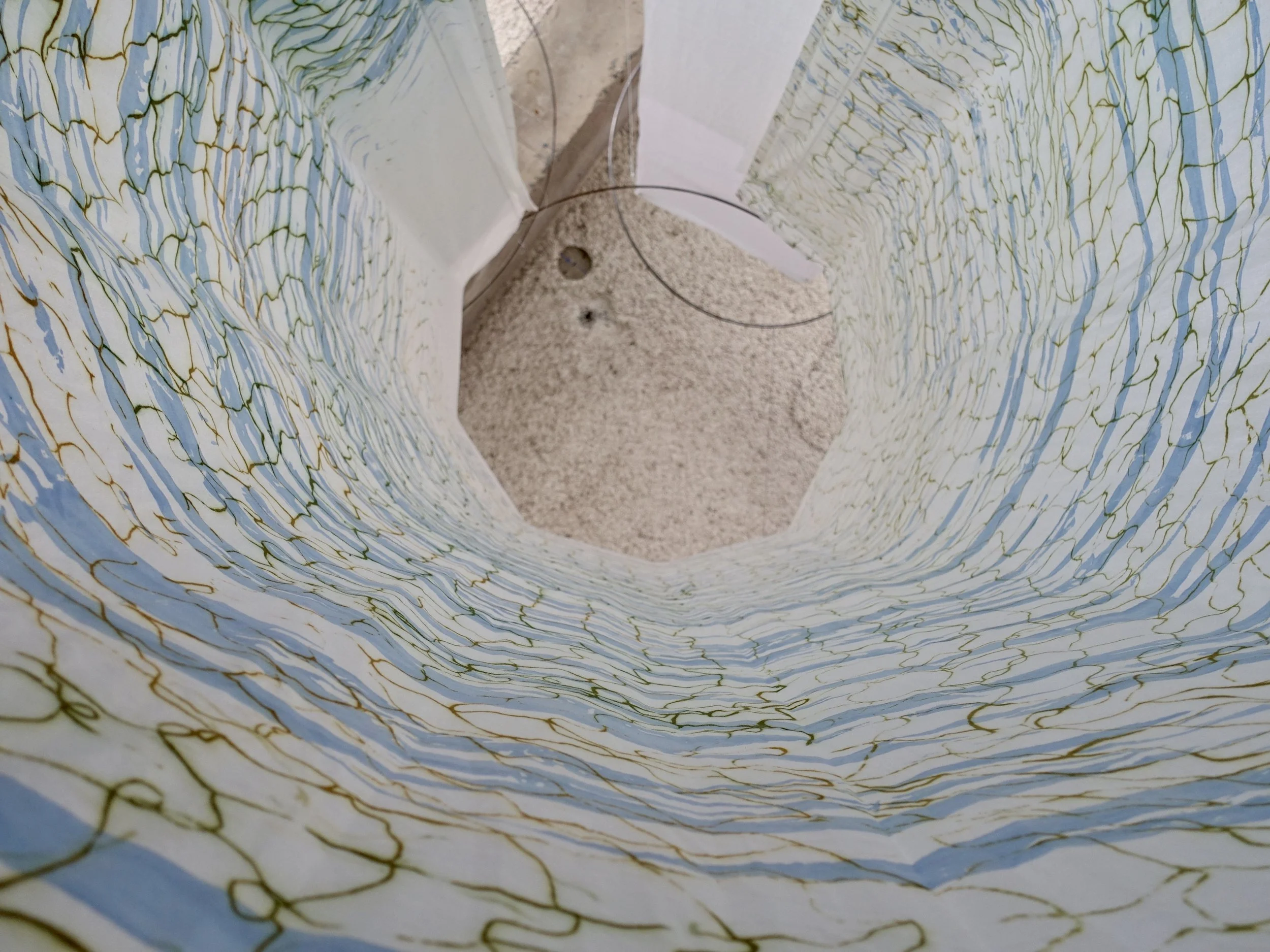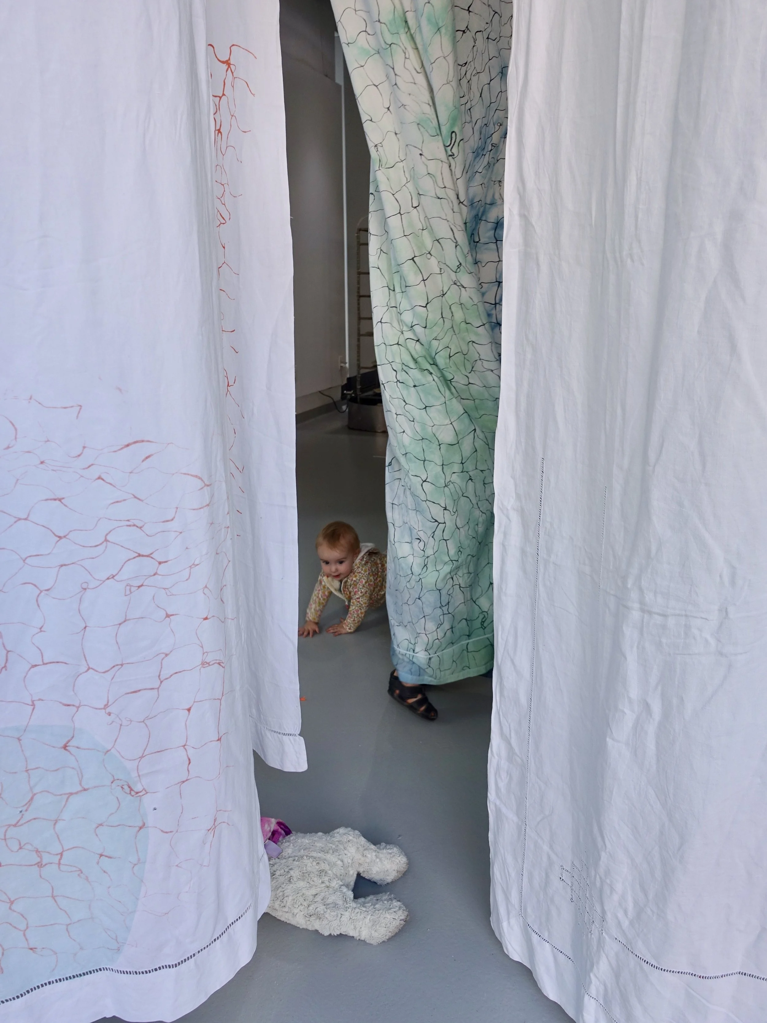 Materials: Linen and cotton sheets, MX dyes, vinyl sulfon, clear bases inks, metal, nylon, steel rings