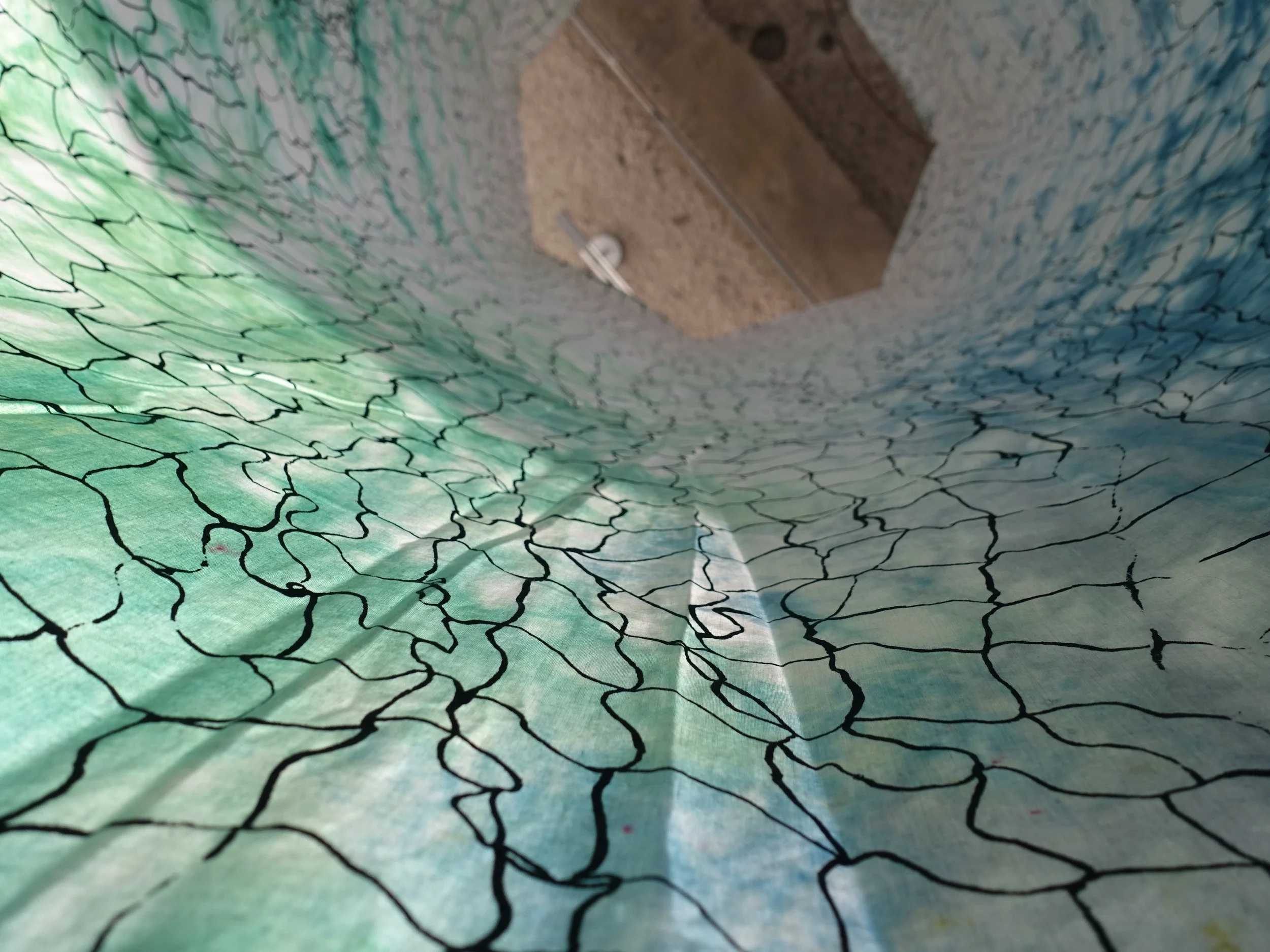 This work is investigating the notions of identity and occupation of space. I’ve been researching the impact of layering material and images to reflect on questions that don’t have a clear and simple resolution. This piece is exploring the possibilities of the net structure in the context of invisible labour in the domestic life. This installation is presenting the juxtaposition of an infinite repeating netting pattern on a flat, woven and dyed surface. The installation offers three cells which the viewer can enter, observe, experience. The space offers the potential for calm and comfort contrasting with the image of the net and its many dimensions.