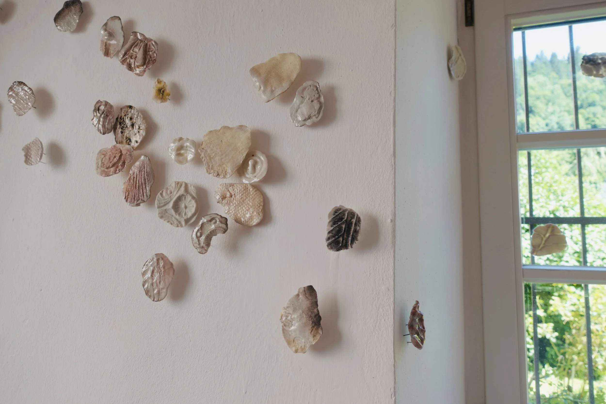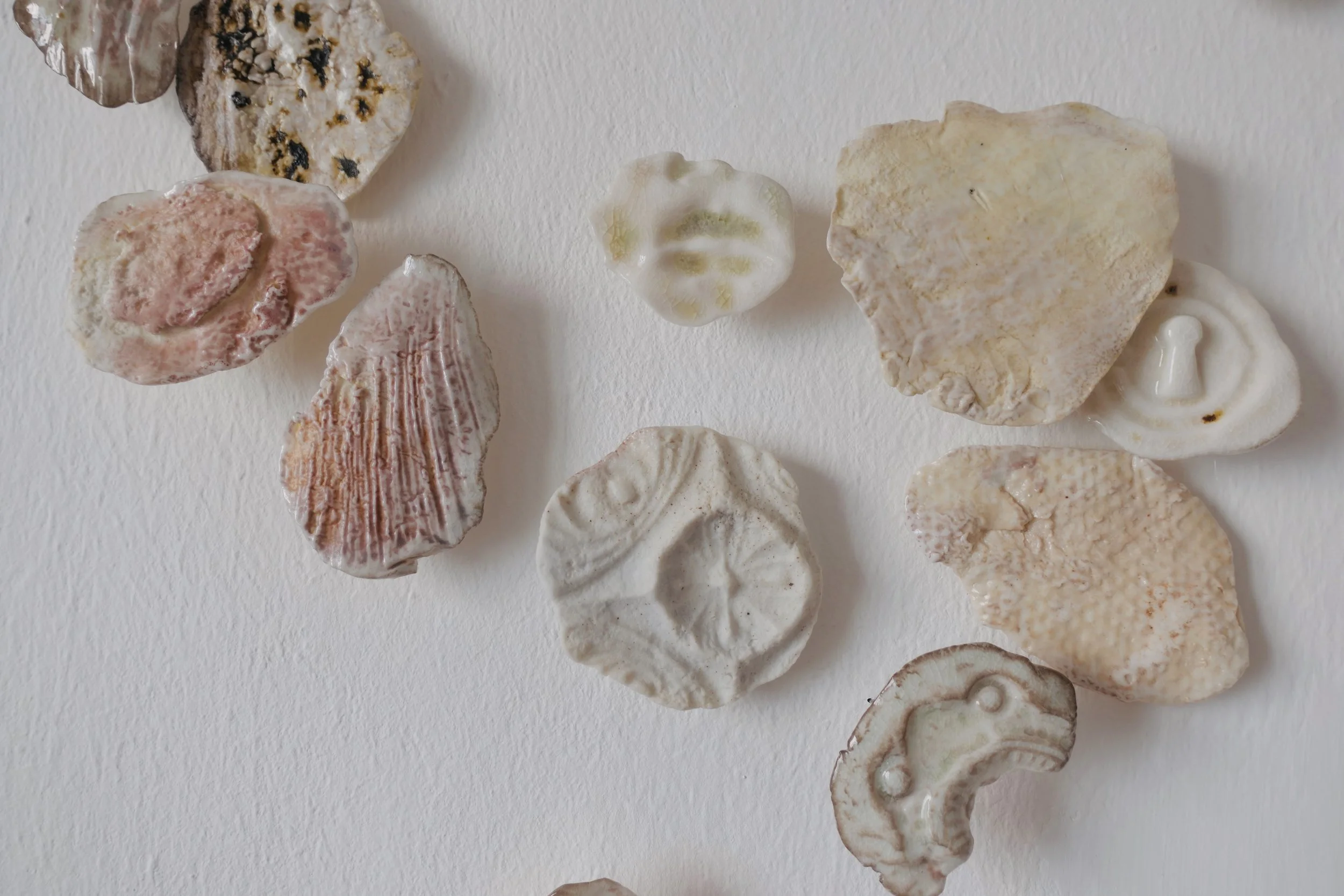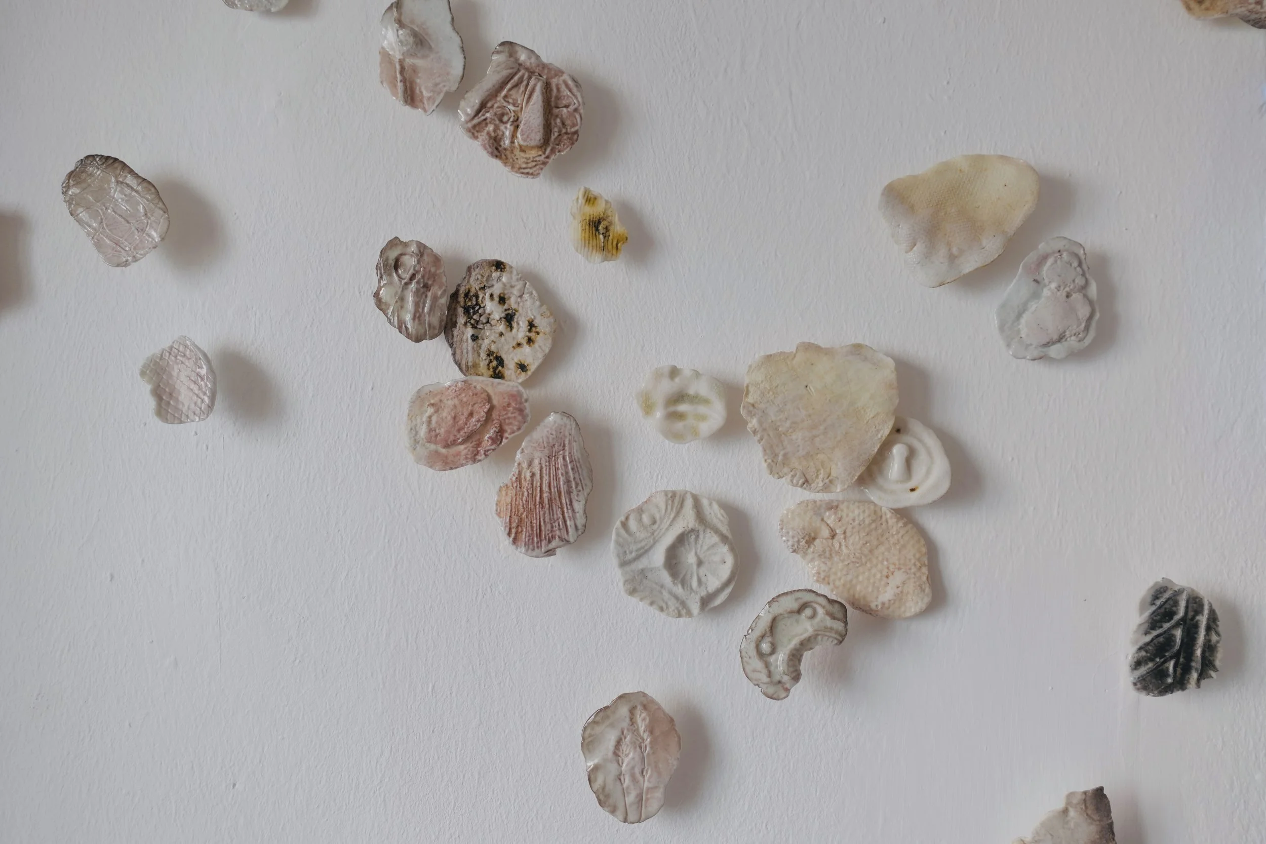 Lors d’une résidence en bord de mer au Danemark, j’ai récolté des empreintes de textures rencontrées au hasard de déambulations solitaires: un cordage, une coque de bateau, un vieux mur, un tronc, une moulure… Ces formes ont ensuite été émaillées et cuites dans des fours à bois du centre de recherche Guldagergaard grâce à un travail communautaire sur place, révélant les marques du feu, du temps, et du contact.