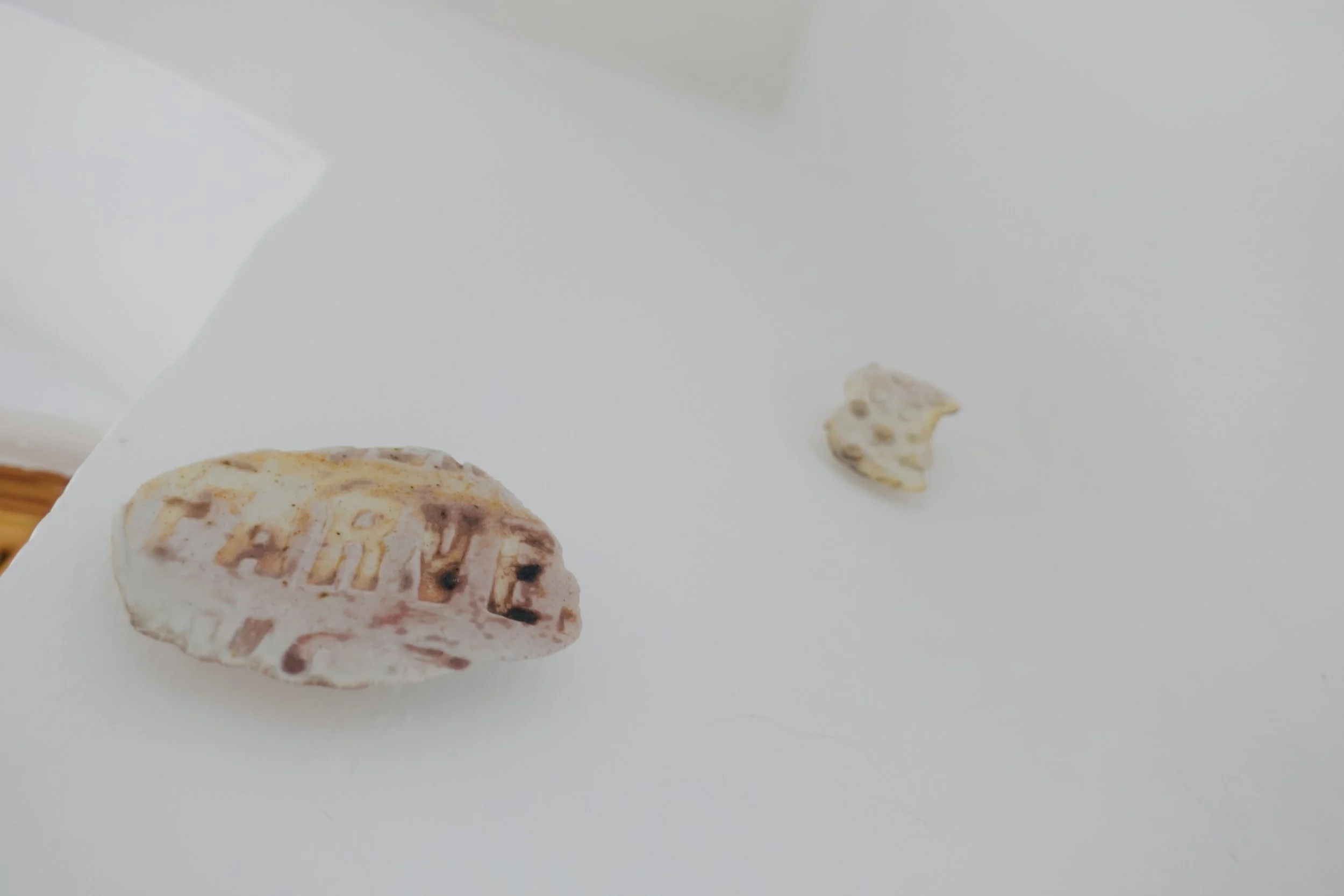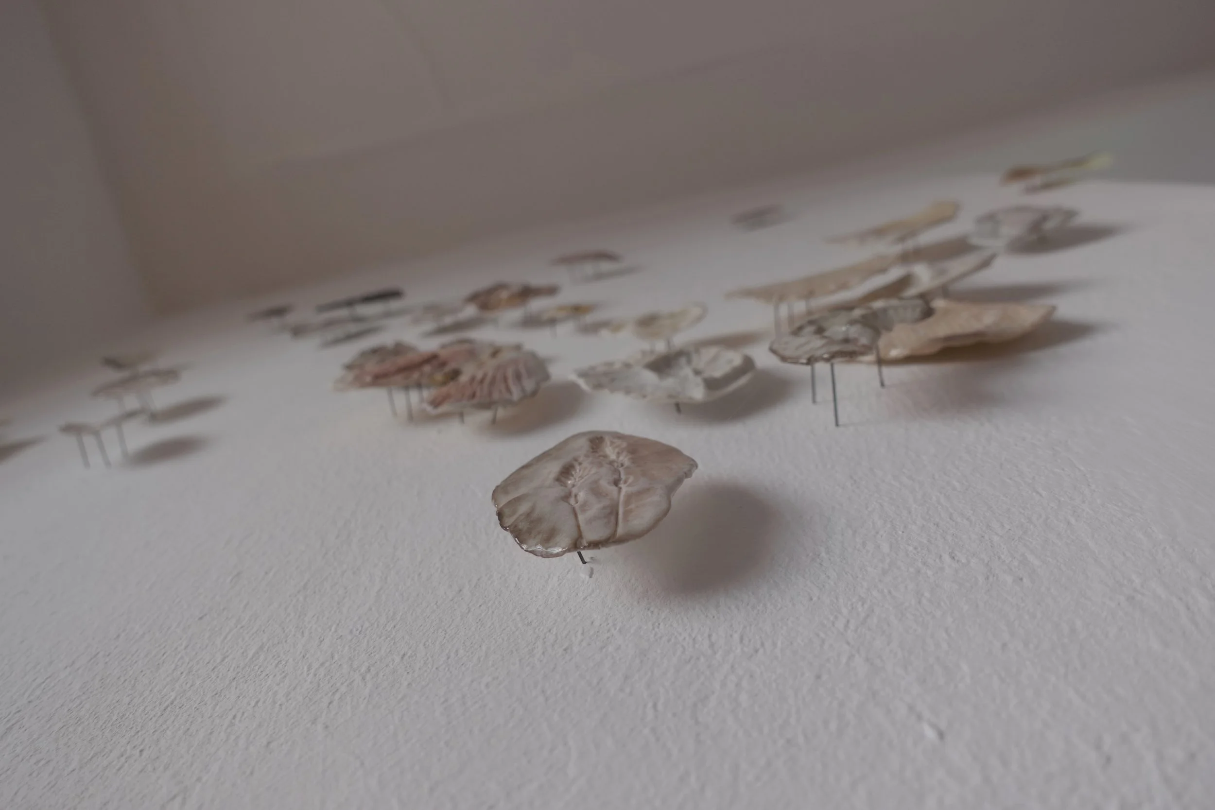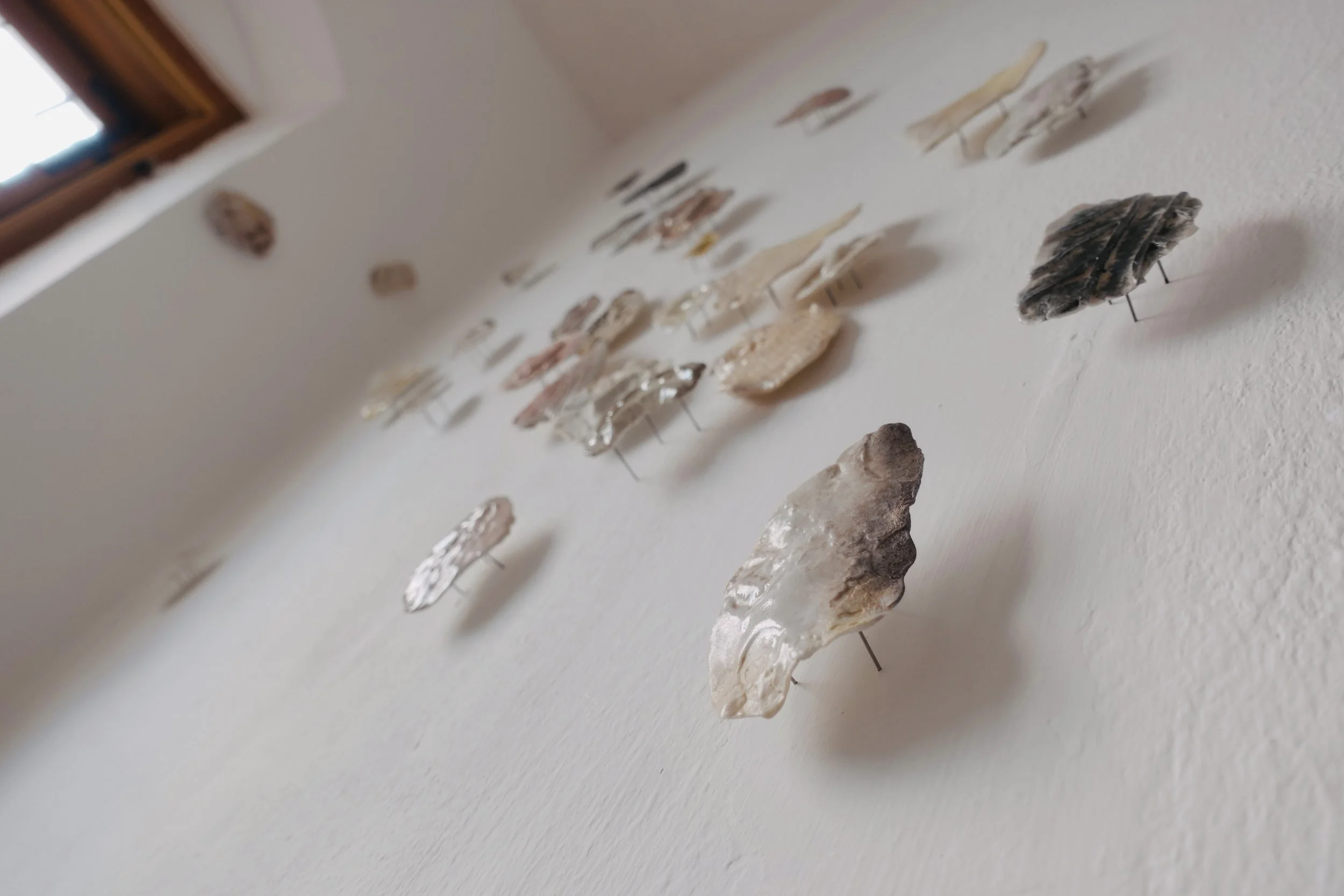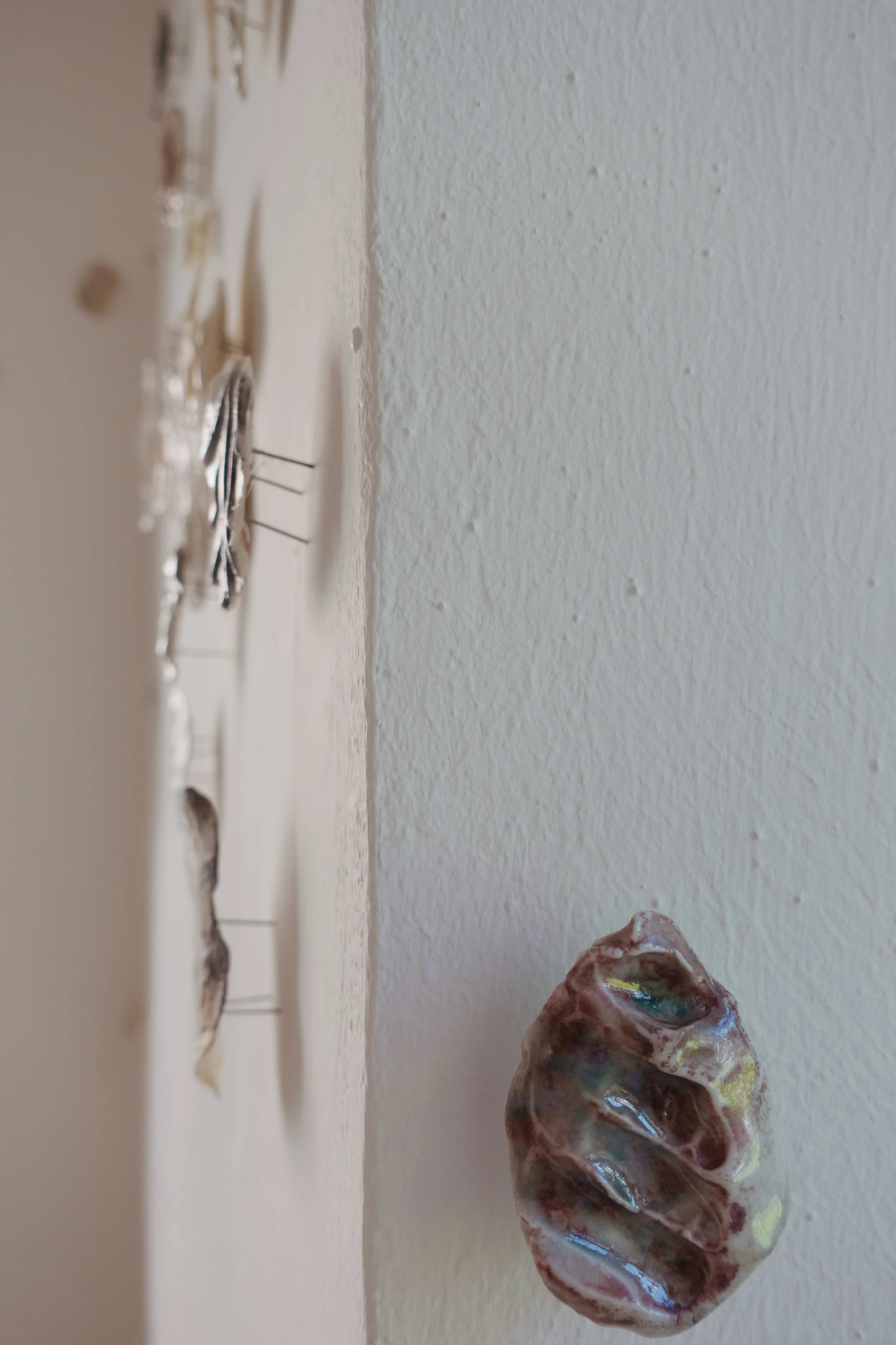 Lors d’une résidence en bord de mer au Danemark, j’ai récolté des empreintes de textures rencontrées au hasard de déambulations solitaires: un cordage, une coque de bateau, un vieux mur, un tronc, une moulure… Ces formes ont ensuite été émaillées et cuites dans des fours à bois du centre de recherche Guldagergaard grâce à un travail communautaire sur place, révélant les marques du feu, du temps, et du contact.